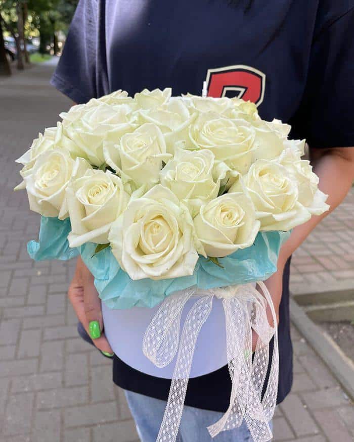 Главная страница » Магазин » Товары на праздник » Цветы » Цветы в коробке » 25 белых роз в коробке